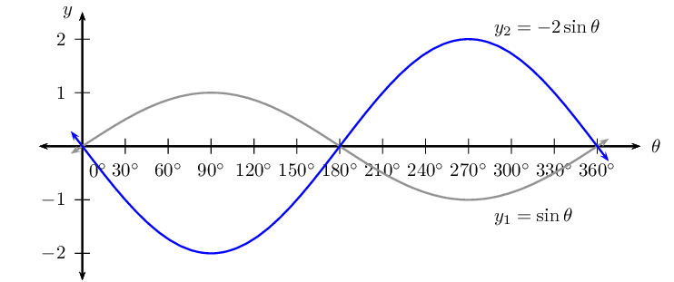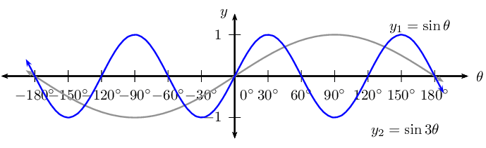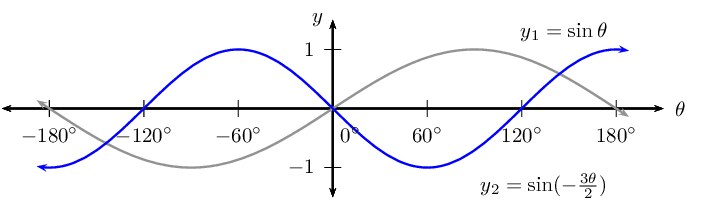 Notice that \(k > 1\) for \(y_2 = \sin \frac{3\theta}{2}\), therefore the period of the graph decreases.