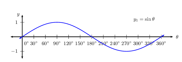 For \(y = \sin \theta\), the domain is \(\{ \theta: \theta \in \mathbb{R} \}\), however in this case, the domain has been restricted to the interval \(\text{0}\text{°} \leq \theta \leq \text{360}\text{°}\).