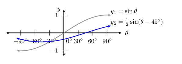 Notice that for \(y_1 = \sin \theta\) we have \(p = 0\) (no phase shift) and for \(y_2 = \sin (\theta - \text{30}\text{°})\), \(p < 0\) therefore the graph shifts to the right by \(\text{30}\text{°}\).