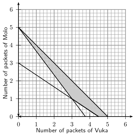 If Vuka cereal costs \(\text{R}\,\text{6}\) per packet and Molo cereal also costs \(\text{R}\,\text{6}\) per packet, use the graph to determine how many packets of each cereal must be used so that the total cost for the mixture is a minimum.