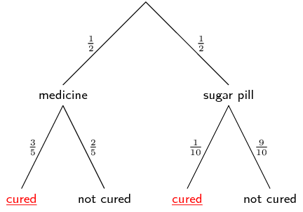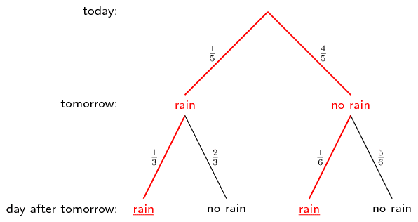 The tree diagram for the experiment is shown above. To save space, probabilities were not indicated on the branches of the tree, but every branch has a probability of \(\frac{1}{6}\). The multiples of \(\text{5}\) are underlined. Since the probability of each of the underlined outcomes in \(\frac{1}{6}\times\frac{1}{6} = \frac{1}{36}\) and since there are \(\text{7}\) outcomes that are multiples of \(\text{5}\), the probability of getting a multiple of \(\text{5}\) is \(\frac{7}{36}\).