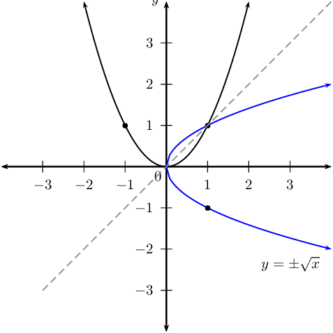 - If \(f(x) = -x^{2}, \text{ for } x \le 0\): \begin{align*} f: \qquad & \text{domain } x \le 0 \quad \text{range } y \le 0 \\ f^{-1}: \qquad & \text{domain } x \le 0 \quad \text{range } y \le 0 \end{align*}