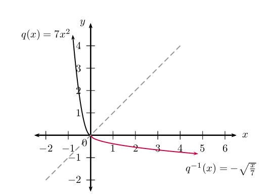 Determine the inverse of \(q(x) = 7x^{2}\) and sketch both graphs on the same system of axes. Restrict the domain of \(q\) so that the inverse is a function.