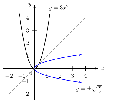 Consider the previous worked example \(h(x) = 3x^{2}\) and its inverse \(y = ±\sqrt{\frac{x}{3}}\):