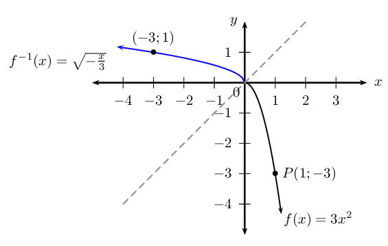 - If \(f(x) = -x^{2}, \text{ for } x \ge 0\): \begin{align*} f: \qquad & \text{domain } x \ge 0 \quad \text{range } y \le 0 \\ f^{-1}: \qquad & \text{domain } x \le 0 \quad \text{range } y \ge 0 \end{align*}