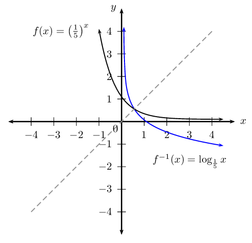 | \(f^{-1}(x) = \log_{\frac{1}{5}}{x}\) | \(\{x: x > 0, x \in \mathbb{R} \}\) | \(\{y: y \in \mathbb{R} \}\) | \(y\)-axis, \(x=0\) |