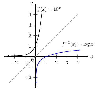 Notice that the inverse is a function: \(f^{-1}(x) = \log{x}\) is a one-to-one function since every input value is associated with only one output value.