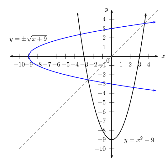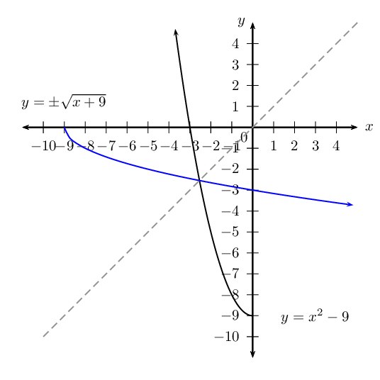 \[\text{Inverse}: \qquad \text{domain } \{x: x \le -2, x \in \mathbb{R} \} \quad \text{range } \{y: y \in \mathbb{R} \}\]Given the function \(H: y = x^{2} - 9\).