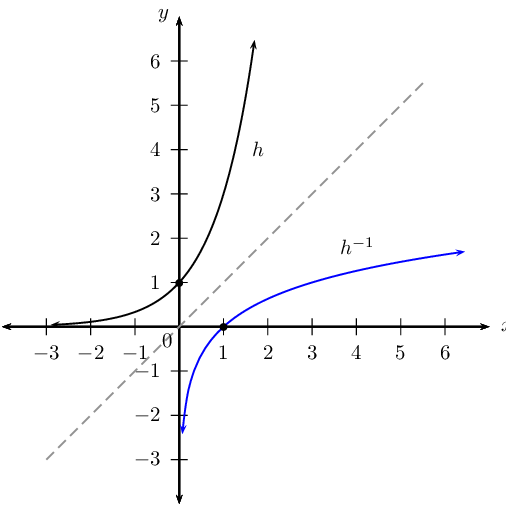The inverse of the exponential function \(f(x) = b^{x}, (b > 0, b \ne 1)\) is the logarithmic function \(f^{-1}(x) = \log_{b}{x}\).