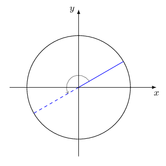 \begin{align*} y &= \left( \text{180}° - \text{45}° \right) + k \cdot \text{180}° \\ \therefore y &= \text{135}° + k \cdot \text{180}°, \quad k \in \mathbb{Z} \end{align*}Notice that for \(k=1\), \(y = \text{135}° + \text{180}° = \text{315}°\), which is the angle in the fourth quadrant.