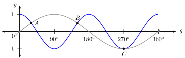 \text{First quadrant: } \theta &= \text{52,53} ° + k \cdot \text{360} °, k \in \mathbb{Z} \\
