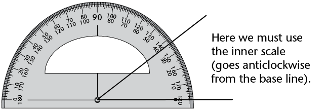 A protractor gives a clockwise degree scale and an anticlockwise degree scale. You choose the correct scale by finding the one that starts with 0° on the angle arm. Look at where the other angle arm passes under the degree scale. That is where your measurement is.