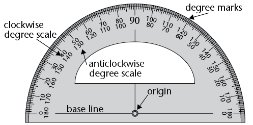 We have a special instrument for measuring angles. It is called a protractor. Look at the picture of a typical protractor with its important parts labelled.
