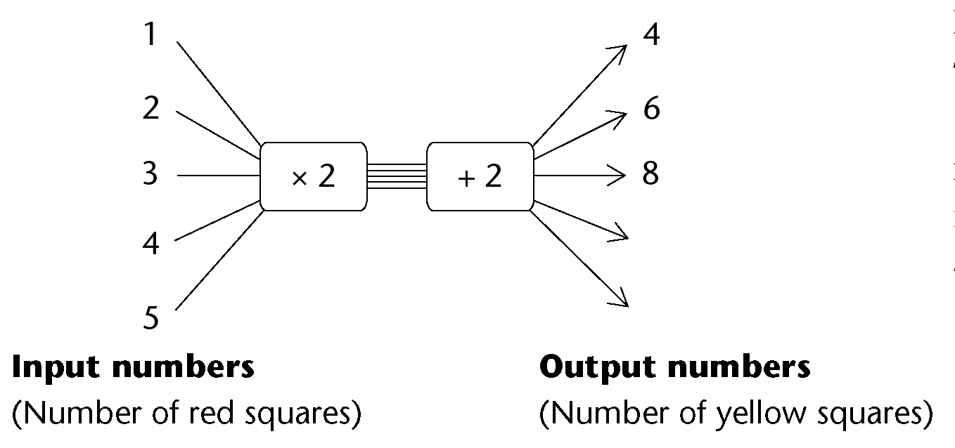 Can you see the connection between the arrangements above and the flow diagram? We can also describe the relationship between the red and yellow squares in words.