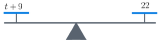 The equation for this balance scale is \(t + 9 = 22\) and to balance it we need \(t = 13\), because \(13 + 9 = 22\).