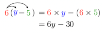 We use this property when simplifying algebraic expressions. For example, to simplify \(5(y - 6)\), we follow these steps: