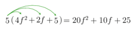For the expression \(5\left(4f^{2} + 2f + 5 \right)\), you must distribute the \(5\) to all three terms in the brackets.