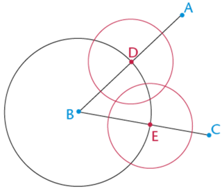 Place the compass on the vertex of the angle (point \(B\)). Draw an arc across each arm of the angle (shown as blue arcs in the diagram below).