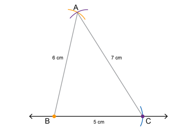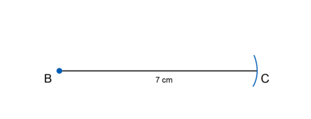 Use your compass to measure a length of \(7 \text{ cm}\) on your ruler. Keeping the width of the compass the same, place the compass on point \(C\) and make a third arc that intersects the second arc. Label the point of intersection \(A\).