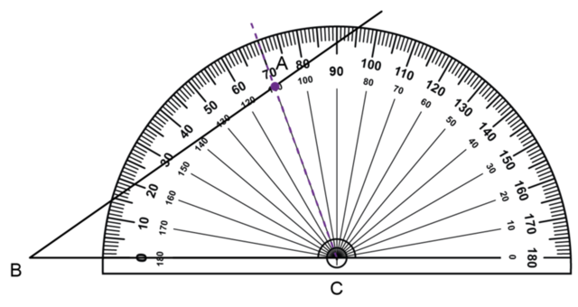 Put the origin of the protractor on point \(C\). On the protractor, use the outer scale from the left and find \(70^{\circ}\). Make a small dot at the edge of the protractor.