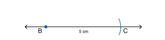 Draw a line segment (longer than \(5 \text{ cm}\)) and mark point \(B\). Use a compass to measure a length of \(5 \text{ cm}\) on your ruler. Keeping the compass width the same, place the compass on point \(B\) and draw a small arc to mark off a length of \(5 \text{ cm}\). Label the point \(C\).