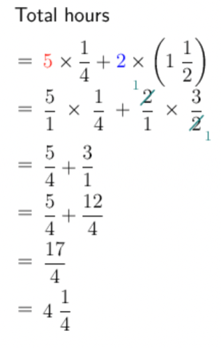 \(5 \times \frac{1}{4} =\) total hours during the week