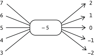 \[\begin{align} 7 - 5 &= 2 \\ 6 - 5 &= 1 \\ 5 - 5 &= 0 \\ 4 - 5 &= - 1 \\ 3 - 5 &= - 2 \end{align}\]Complete the flow diagram.