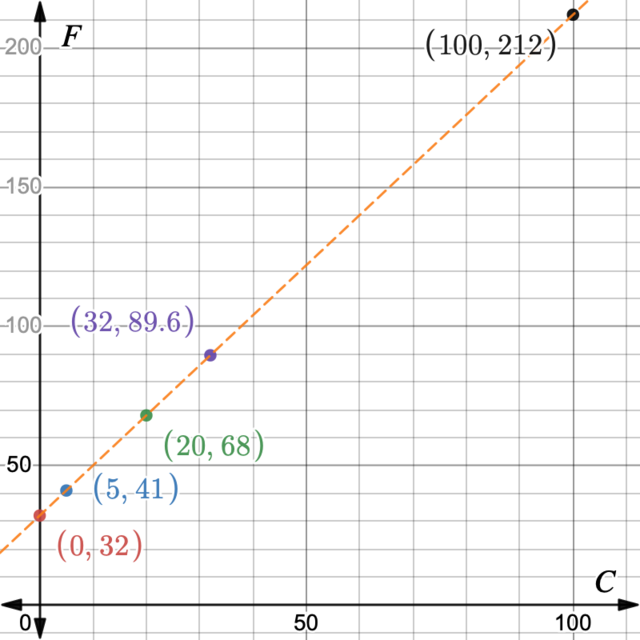 We can also show this relationship as a graph, where the Celsius values are shown on the \(x\)-axis and the