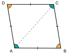 A rhombus has two pairs of opposite angles that are equal. A diagonal divides the rhombus into two isosceles triangles.