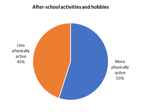 Sports \((28 \%)\); Reading \((22 \%)\); Video games \((15 \%)\); Dancing \((15 \%)\); Singing/choir \((12 \%)\); Chess \((8 \%)\)