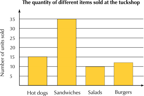 The school tuckshop staff kept a record of how many hot dogs, sandwiches, salads and burgers they sold in one day. The bar graph represents the data they collected.