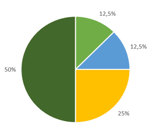 We know that one eighth (half a quarter) of the circle is \(\text{12,5}\%\), we can use this fact to estimate \(8\%\) for the kitchen category and the remaining sector will represent \(42\%\) for the bathroom category.