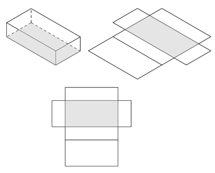 The diagrams below show a cuboid unfolded into a net, which has six rectangular faces. Notice that the rectangular faces are made up of three pairs of identical faces: