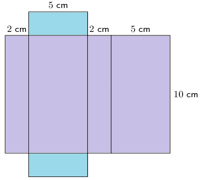 \[\begin{align} \text{Surface area of cuboid} &= 2(\text{area rectangle }1) + 2(\text{area rectangle }2) + 2(\text{area rectangle }3) \\ &= 2(20) + 2(50) + 2(10) \\ &= 40 + 100 + 20 \\ &= 160 \end{align}\]OR