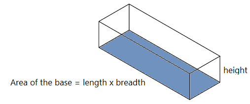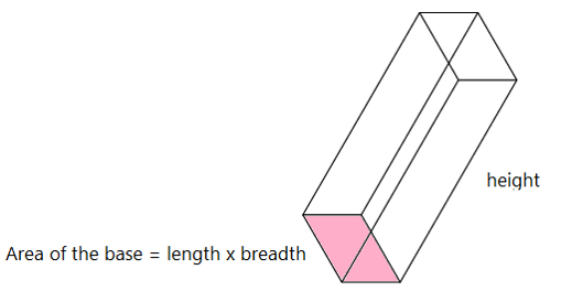 The volume of a cuboid is calculated by multiplying the area of the base by the height of the cuboid.