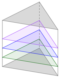 \[\begin{align} \text{Volume of prism} &= \text{area of base} \times \text{height} \\ &= \frac{1}{2}(b \times h) \times h \end{align}\]