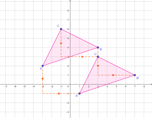 - Draw \(\triangle A'B'C'\), the image of \(\triangle ABC\), translated 4 units to the right and 3 units downwards.
