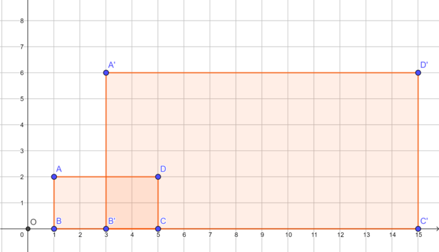 The diagram shows rectangle \(ABCD\) and its image \(A'B'C'D'\) under an enlargement transformation with the origin as the centre of enlargement.