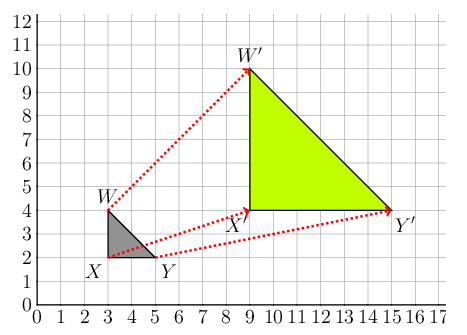\[ \begin{align*} \frac{X'Y'}{XY} &= \frac{15 - 9}{5 - 3} \\ &= \frac{6}{2} \\ &= 3 \end{align*} \]We can calculate the lengths of the vertical sides \(XW\) and \(X'W'\) by subtracting the values of the corresponding \(y\)-coordinates.