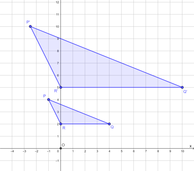 The diagram shows \(\triangle PQR\) and its image \(\triangle P'Q'R'\) under an enlargement transformation with the origin as the centre of enlargement.