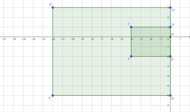 The diagram shows rectangle \(DEFG\) and its image \(D'E'F'G'\) under an enlargement transformation with the origin as the centre of enlargement.