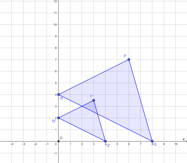 The diagram shows \(\triangle PQR\) and its image \(\triangle P'Q'R'\) under a reduction transformation with the origin as the centre of reduction.