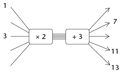 To find the input number that corresponds to 13, you may ask yourself, "What did I have before I added 3?" and then, "What did I have before I multiplied by 2?"