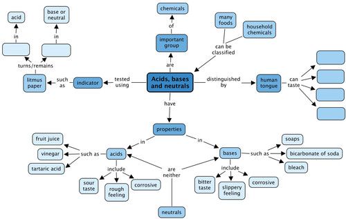 The human tongue can taste 4 main different tastes. What are these? Fill them in the spaces below. You also need to complete the section of the concept map about indicators. Can you work out how to do this? You need to fill in the colour that litmus turns (or remains) in each either an acid or a base (or neutral).