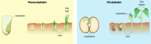 Look at the following image which shows the difference between monocotyledonous seeds and dicotyledonous seeds. Monocotyledons have one cotyledon and dicotyledons have two cotyledons.