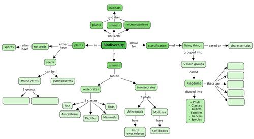 This concept map shows how the concepts in this chapter on Biodiversity link together. Complete the concept map by filling in the five Kingdoms that living things are classified into, and also giving the two major groups of angiosperm plants.