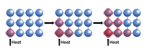 When energy is transferred to an object, the energy of the particles increases. This means the particles have more kinetic energy and they start to move and vibrate faster. As the particles are moving faster they "bump" into other particles and transfer some of their energy to those neighbouring particles. In this way, the energy is transferred through the substance to the other end. This process is called conduction. The particles conduct the energy through the substance, as shown in the diagram.