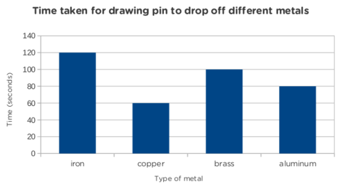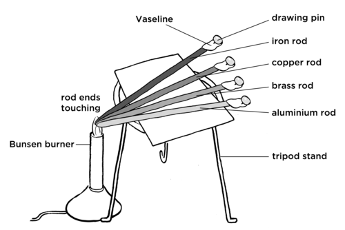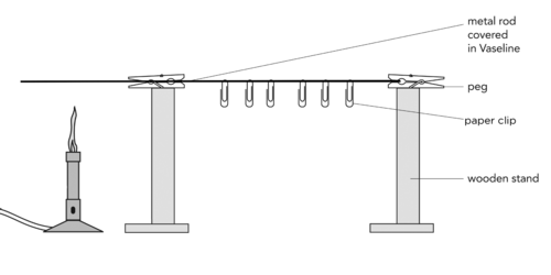 As an extension exercise you could include another investigation in which you measure the rate of energy conduction along a metal rod. Repeat the experiment placing drawing pins at 5cm intervals on a long metal rod. Clamp the metal rod and heat one end over a Bunsen burner. Use a stopwatch to time how long it takes for each drawing pin to drop and record the results on a graph. This could be further extended by using different metals and putting all the results on a single set of axes. The gradient of the graphs would give the rate of heat conduction.