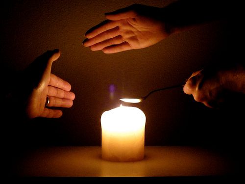 The hand on the right holding the spoon represents conduction as the heat is transferred from the flame through the metal of the spoon. The hand above the candle represents convection as heat is transferred from the flame by moving air particles which warm up and rise. The hand above the candle will also experience heat from radiation as heat is radiated in all directions. The hand on the left next to the candle represents radiation as energy is transferred from the source through space to the hand.