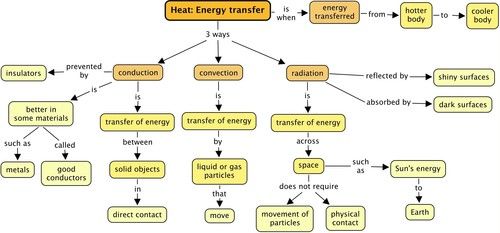 Below is a concept map showing how the different topics about heat together. You need to fill in the three different ways that energy can be transferred, as discussed in this chapter, but you cannot just put anyone into any box. You need to study the concepts which come after and explain each way of transferring energy during heating.
